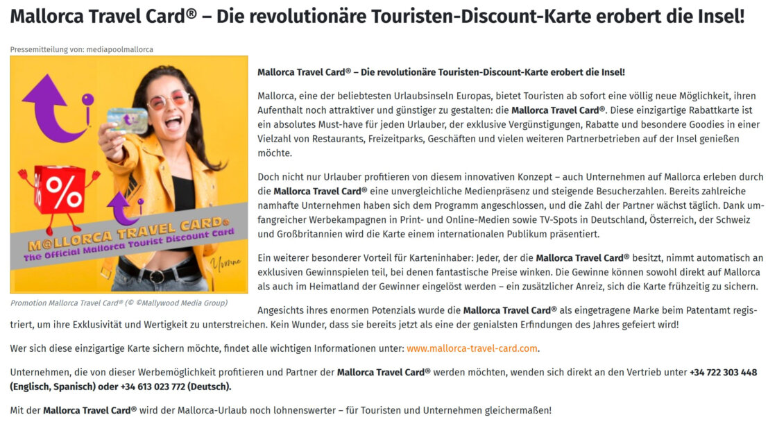 Werden Sie Partner der M@llorca Travel Card und profitieren Sie von einer starken Präsenz bei reisefreudigen Kunden! Mit exklusiven Rabatten locken Sie mehr Gäste in Ihr Geschäft, steigern Ihre Umsätze und setzen sich von der Konkurrenz ab. Unsere Karte bringt Ihnen genau die Kunden, die nach Ihren Angeboten suchen. Nutzen Sie diese Chance, um Ihre Marke zu stärken und Teil eines einzigartigen Netzwerks zu werden.